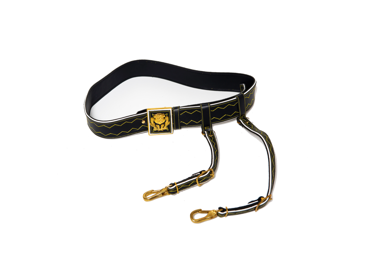 Belt is made of blue leather with white edges and golden seamse. Belt is stitched with two golden 120 degree seamse.