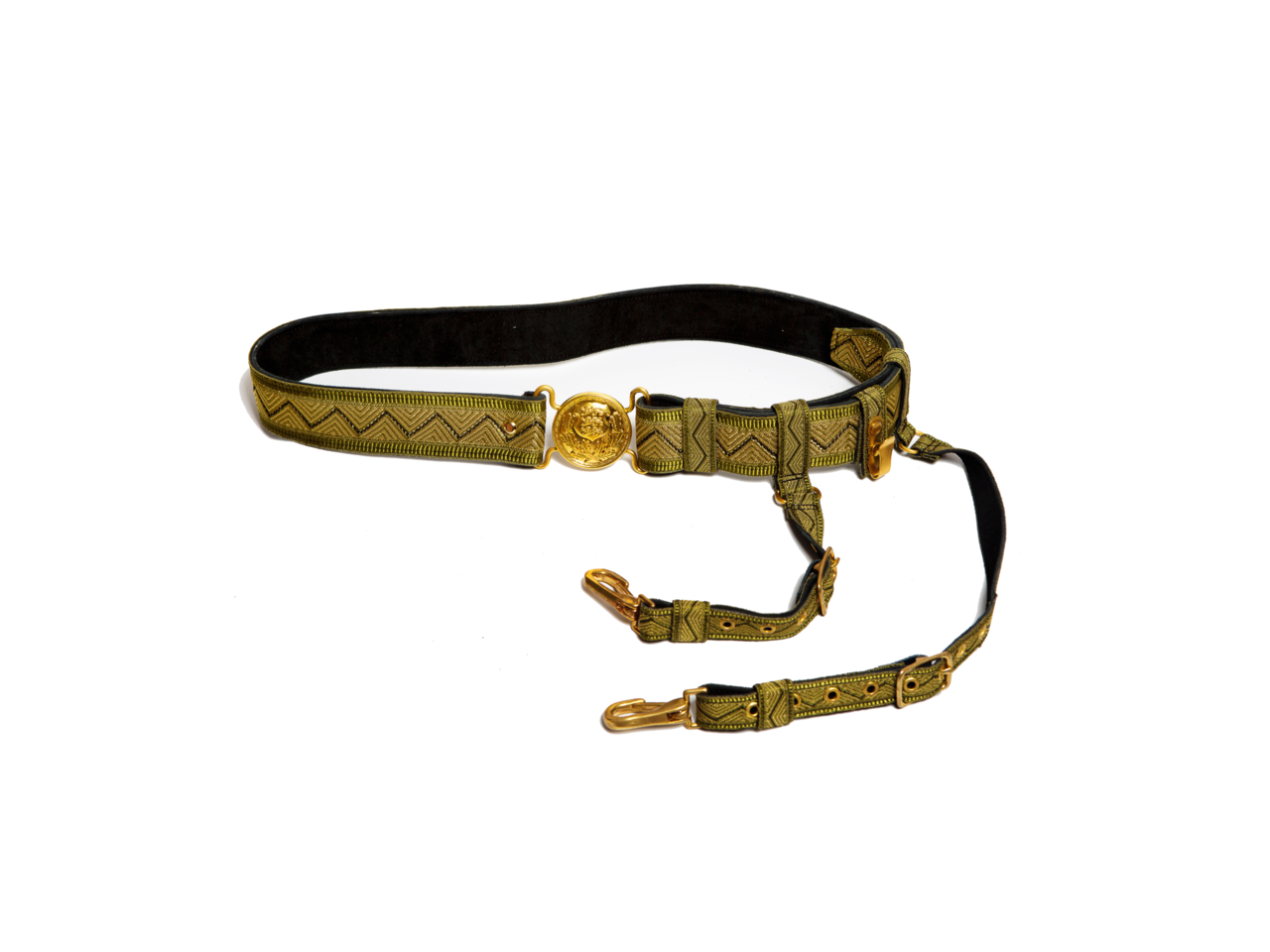 Or golden sword belt is worn only with the army officers sword.Belt is made of black leather which is covered with green and golden woven fabric.